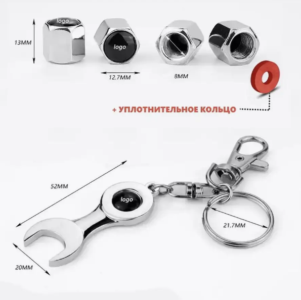 У комплект входять чотири металеві ковпачки та брелок з емблемою, який зручно використовувати як відкривачку.